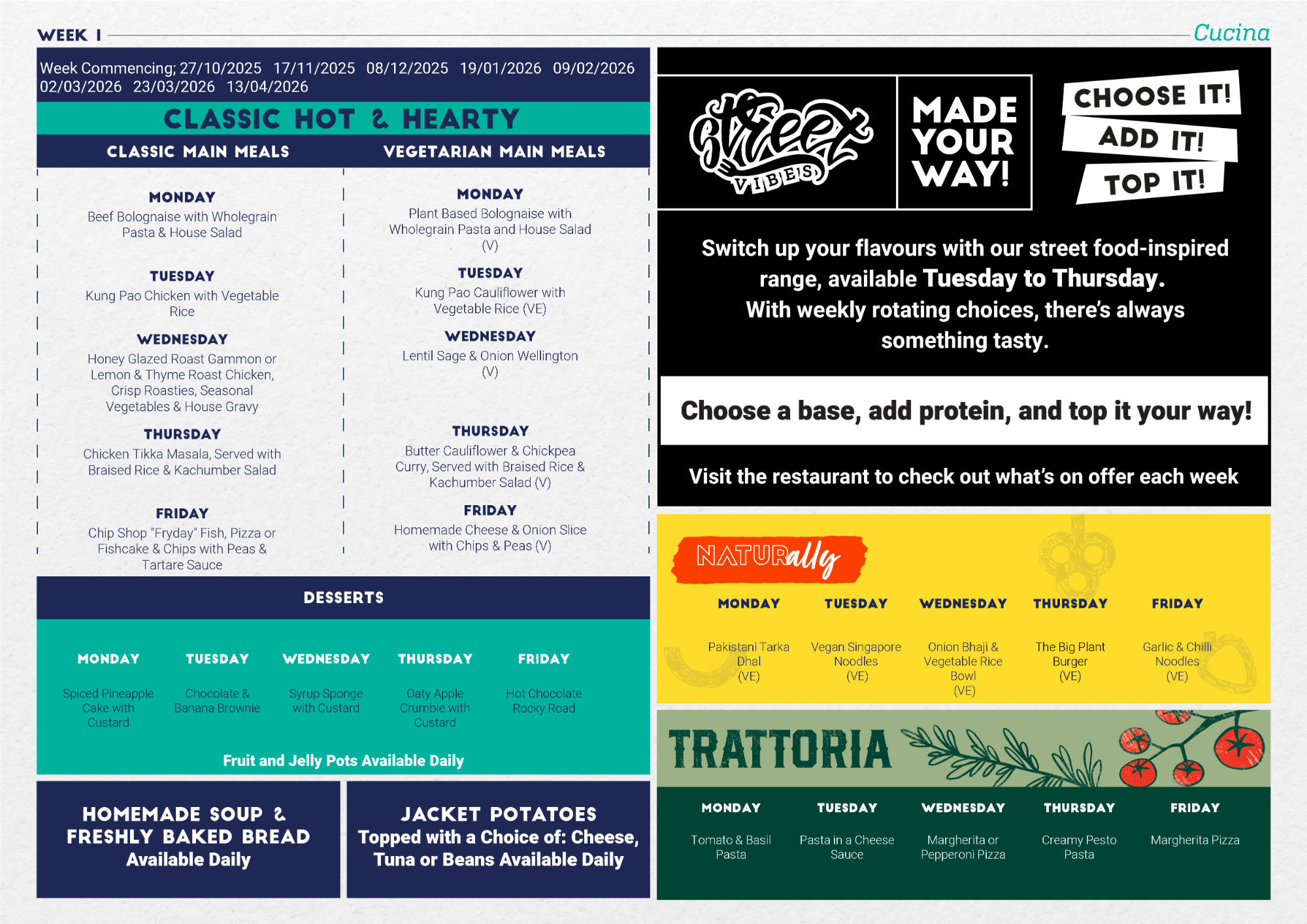The school canteen is run by a team from Cucina.  See below their price information and food offering.